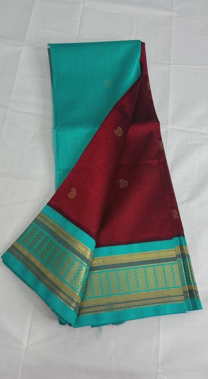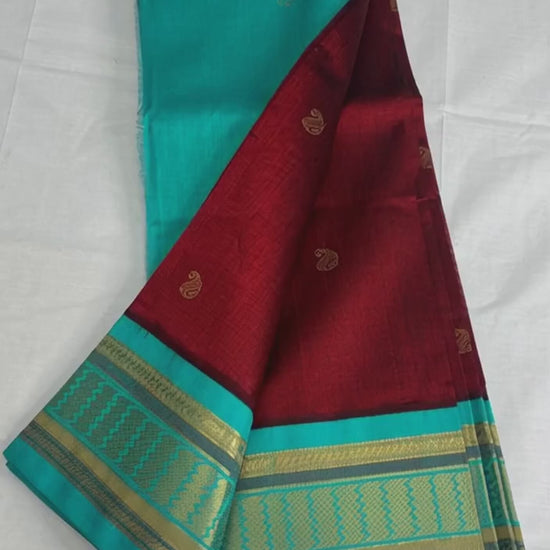 Pure Silk cotton saree in Maroon with teal korvai zari border