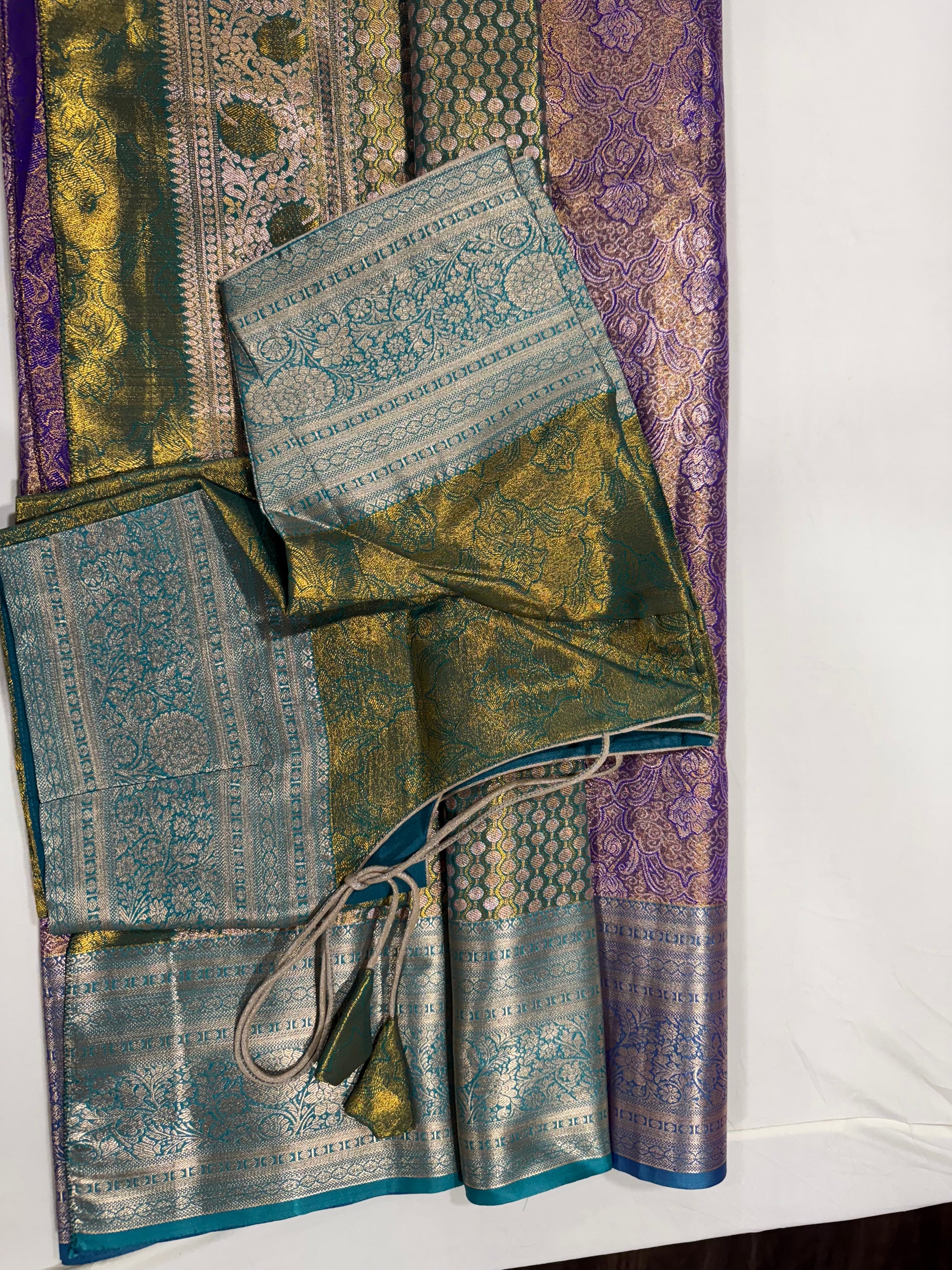 Tissue silk saree in purple and green With stitched blouse